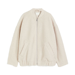 Bomberjacke in Teddylook von H&M // Rollkragenpullover in Creme von H&M // Leichte Hose in weiß von H&M // Dunkelbraune Lederhandtasche von Saint Laurent // Nubukleder-Stiefel von Zara // Goldene Ohrringe von Mango