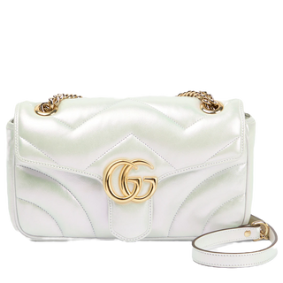 Body mit kurzem Kragen von Zara // Rock in Metallicoptik von Zara // Lange Ohrringe in Silber von Zara // Irisierende Handtasche von Gucci // Lipgloss von Rare Beauty